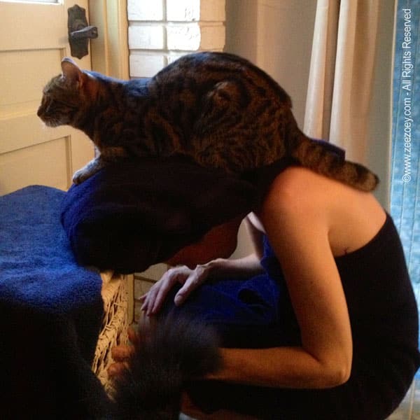 It’s a rather awkward and uncomfortable pose for me; I feel extremely vulnerable wrapped only in a towel while I am getting ready for work, but this has now become "our thing." She literally sits on top of my bent-over head every morning and kneads the back of my head with her paws until she settles in for a nap. It really is sweet and I don’t dare move her off until she is ready. I am very happy she is building her confidence and enjoying the bond we have, but I do kind of wish she could be a bit more conventional. Not to mention, the "my cat was sleeping on my head and that is why I was late" excuse is wearing thin at work.